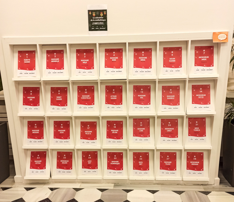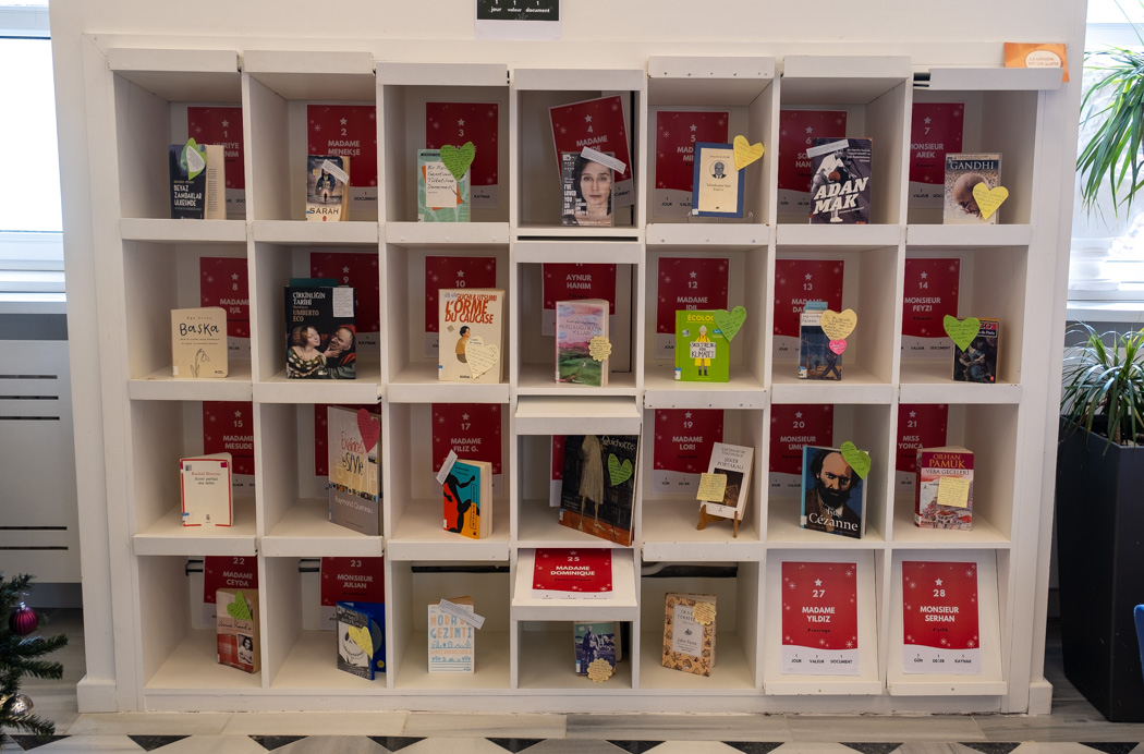 Aralık ayı boyunca, Medyatek kitapları ve filmleri okulumuzun değerleriyle bağdaştırılarak, eğitim kadromuzun 28 üyesinden tamamen öznel görüş ve tavsiyeler alındı… Böylece Medyatekte dev bir Noel takvimi oluşturuldu. Her gün, kutulardan biri, farklı bir öğrenci tarafından açıldı; kutuların içinde çikolalata değil, okulumuzun değerleri süzgecinden geçirilmiş kitap ya da film tavsiyeleri vardı. Bu temel değerler: iyi yüreklilik, yaratıcılık, angajman, cesaret ve disiplin.