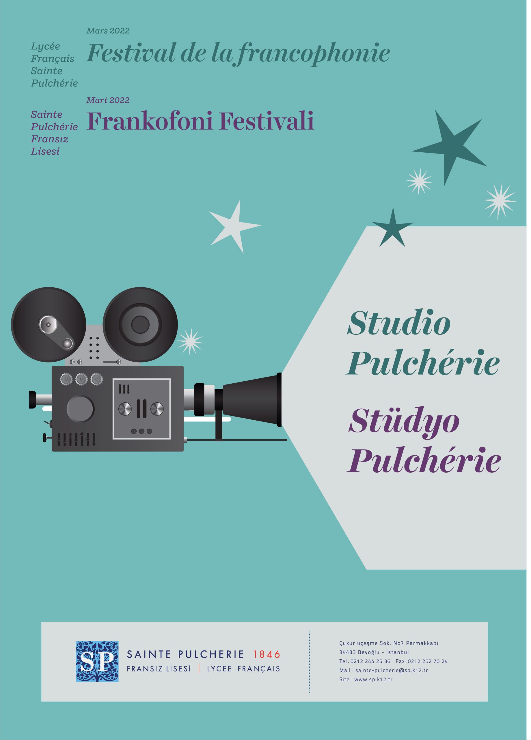 2022 Frankofoni Festivalinde Sainte Pulchérie ana tema olarak sinemayı seçti. Tüm ekipler, bu büyük etkinliğin sadece Fransızca derslerinde değil, aynı zamanda Türkçe işlenen derslerde de yankılanması için hayal güçlerini iki katına çıkardı. Festivalimizin vaad ettiği harika anları programa göz atarak keşfedin. Yaşasın Fransız dili ve Frankofon kültürü!