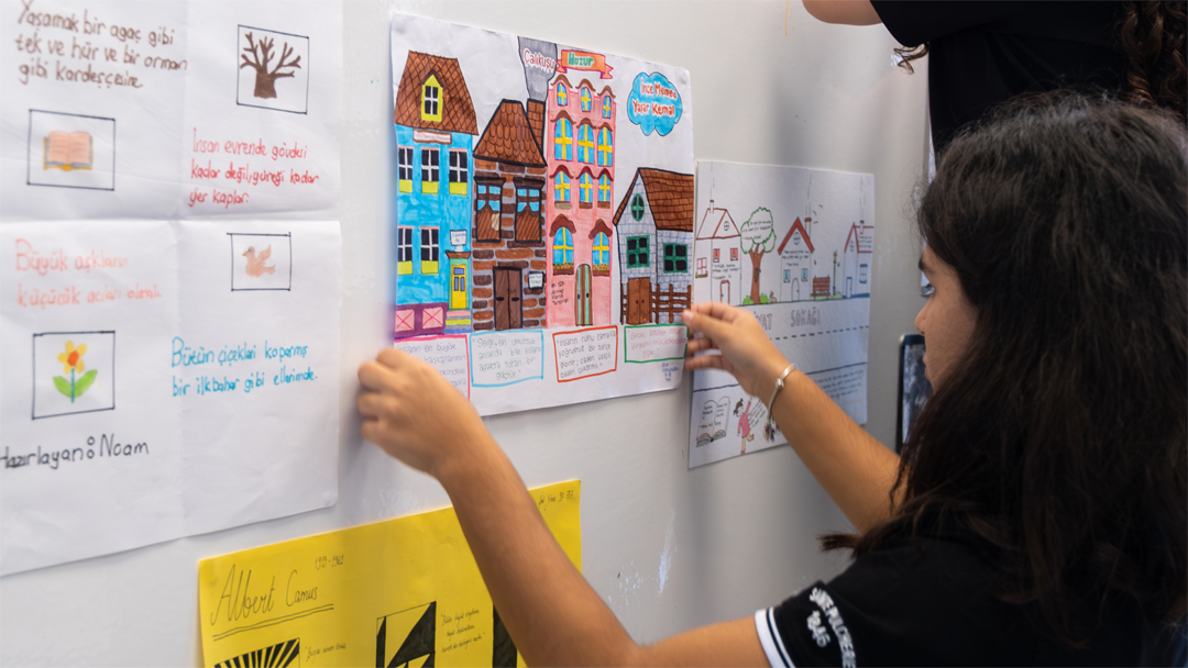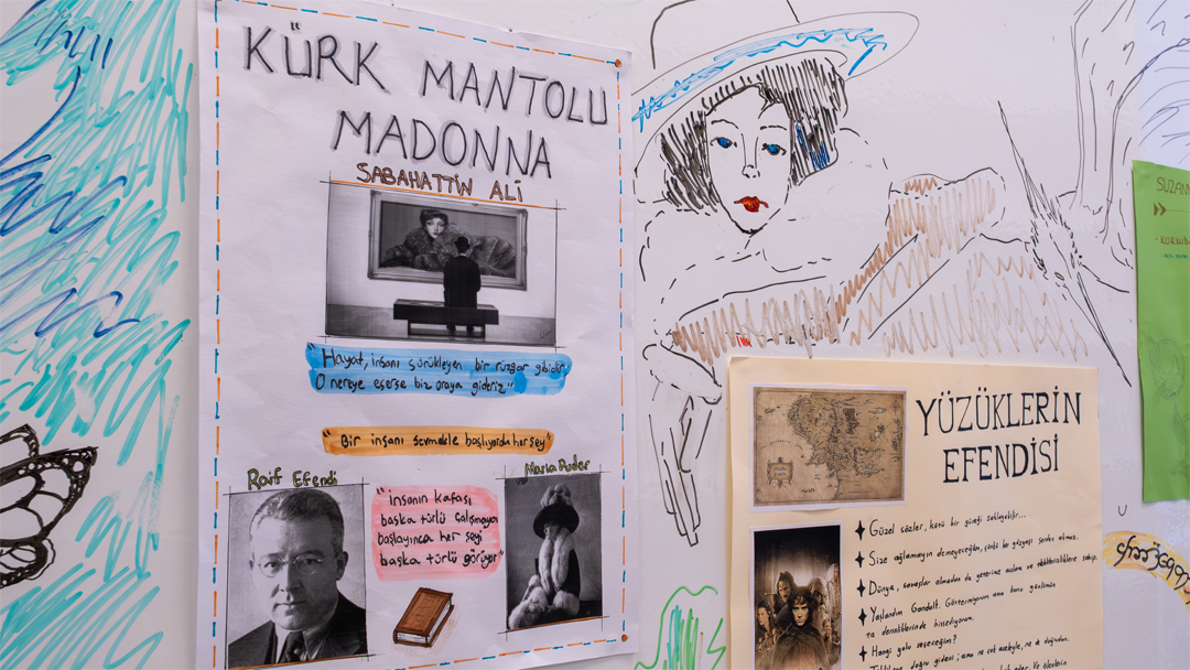 Bu etkinlikte öğrenciler, sevdikleri yazarların eserlerinden en çok etkilendikleri sözleri seçip onları görsellerle süslediler ve kendi bakış açılarını da katarak duvarımıza astılar.