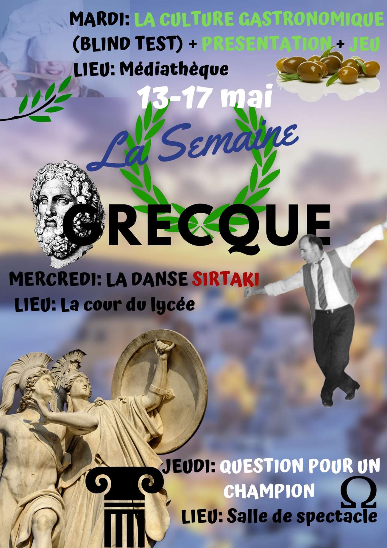 Le comité d’activités et de culture d’élèves a mis en place une semaine d’activités sur le thème de la Grèce. Grèce qui était à l’honneur cette année à travers les différents clubs du lycée. En cette fin d’année scolaire, ils reviennent sur la manifestation avec un texte signé par le comité en français.