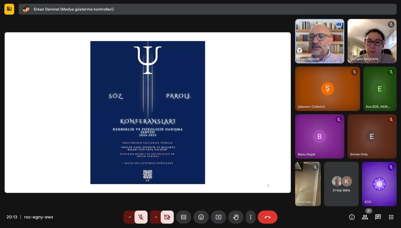 Rehberlik ve Psikolojik Danışma Servisi’nin düzenlediği Söz/Parole konferansları kapsamında 7 Mayıs Çarşamba akşamı Eğitimci, Profesyonel Koç Dr Erkan DEMİREL “Meslek Nasıl Edinilir ve Meslekte Başarı İçin Genç Gelişimi” konusu hakkında bilgi vermek üzere velilerimizle çevrimiçi olarak bir araya geldi.